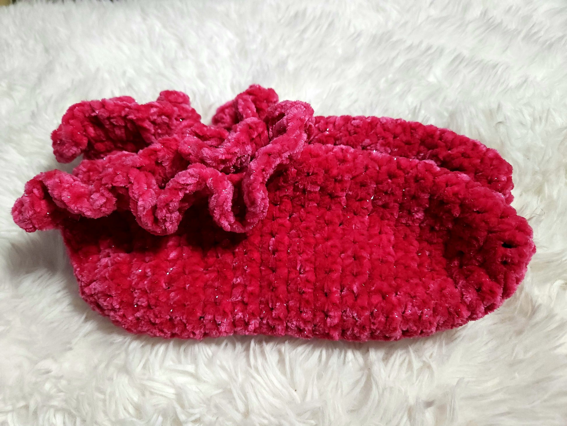 Treat yourself to the ultimate cozy experience with these ruffle slipper socks. Crocheted from Juicy Luxe Velour Yarn by Juicy Couture®, they provide an inviting texture and inviting warmth that you won't want to take off. Available in various sizes and many colors, you can have the perfect look for lounging.